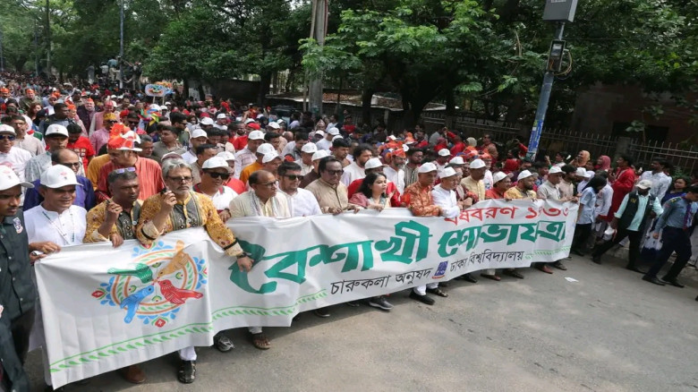 রাজধানী ঢাকায় বর্ষবরণের কেন্দ্রবিন্দুতে রয়েছে ঢাকা বিশ্ববিদ্যালয়ের চারুকলা অনুষদ আয়োজিত বৈশাখী শোভাযাত্রা। এবারের শোভাযাত্রায় ‘শান্তি, সৃজন, গৌরব ও গতিময়তা’র প্রতীক হিসেবে মোরগ, বেহালা, পায়রা, হাতি ও ঘোড়ার মনোমুগ্ধকর মোটিফ স্থান পেয়েছে। রঙিন প্রতিকৃতি ও বাদ্যযন্ত্রের তালে মুখরিত এই আয়োজনের মূল বার্তা—অশুভ শক্তির বিনাশ এবং কল্যাণময় ভবিষ্যতের আহ্বান।